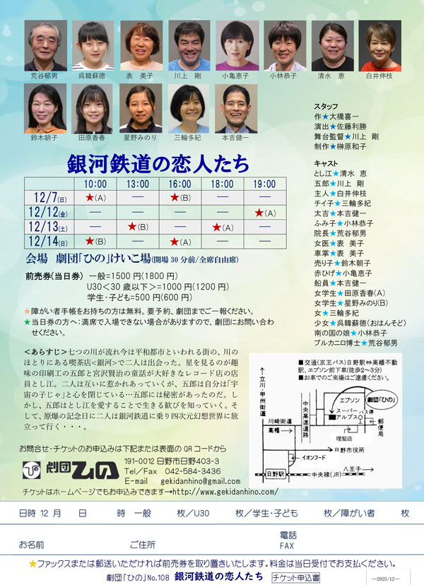 今年の8月、数人の劇団員が広島に行き平和記念資料館などで学んできました。劇団では、第五福龍丸展示館、原爆の図丸木美術館に行き、原爆の社会的被害・残酷性、身体や心への人間的被害・苦しみを学びました。 「銀河鉄道の恋人たち」は、原爆というあやまちを、被爆者の恋愛や生き方を軸に描き、人間の生や死・尊厳を「銀河」という広大な宇宙(世界)から俯瞰・昇華する事により……過去を知り 今を問い 明日への道を示すドラマです。 ♣新しい仲間とともに